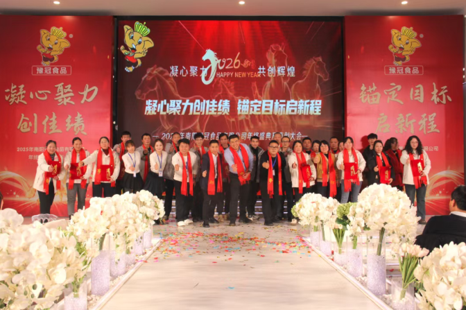 金蛇辞旧岁,骏马启新程。2026年新春将至,南阳豫冠食品“凝心聚力创佳绩 锚定目标启新程”年度盛典如期启幕,全体豫冠家人欢聚一堂,复盘2025年奋斗荣光,共绘2026年发展蓝图,在温情与喜悦中续写成长篇章。